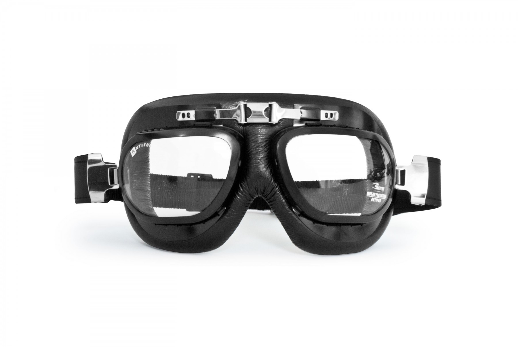 Motorradbrille Schutzbrille vintage für Harley Davidson und Chopper schwarzes Leder Antibeschlag und UV Schutz Stahlprofil by Bertoni Italy AF191A. Rahmen: schwarz mit matt schwarz Stahlprofil. Antibeschlag Gläser aus bruchsicherem Polycarbonat 2.4mm. Qualitatives elastisches Kopfband mit schwarzer Seide bedeckt.