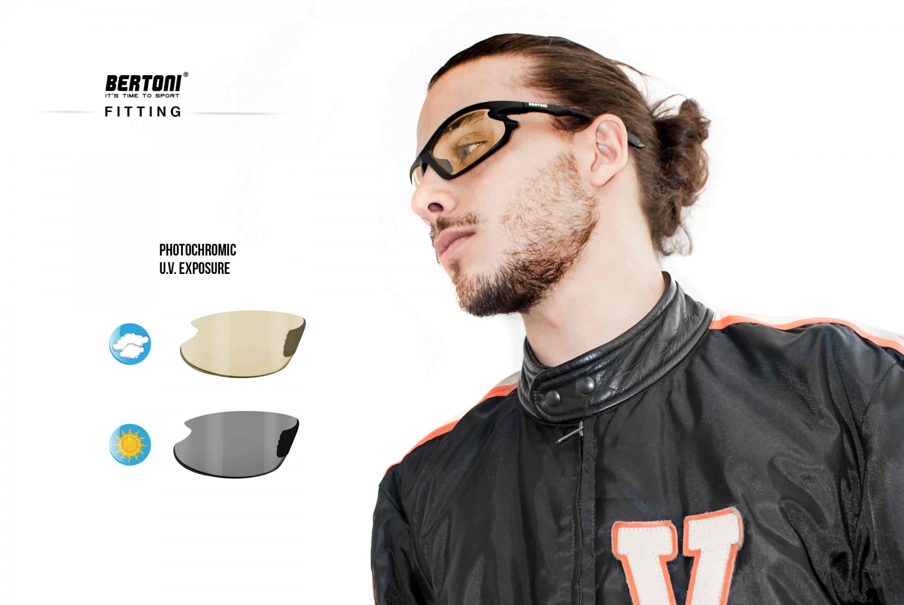 Selbsttönend Motorradbrille – F676 by Bertoni Italy – Winddichte Sonnenbrille: Photochromen Linsen Kat. gelb 1 bis grau 2, 100% UV-Schutz - Die photochromen Linsen passen sich veränderten Lichtverhältnissen an. Rahmen: flexible Nylon Mesh - Es ist leichtgewichtig und haltbar für ganztätigen Schutz. Gewicht 18 grames. - Größe: für schmale, normale und große Gesichter. Robuste Polycarbonatgläser, schützen die Augen vor Verletzungen. - Rahmenlose Gläser: bessere Belüftung. Gute Abdeckung: Wind und Witterungsschutz - bessere periphere sicht. - Ergonomisch Nasenpads zur Anpassung an die Nasenform. - Weiche Nasenpads und Bügel für guten Halt.