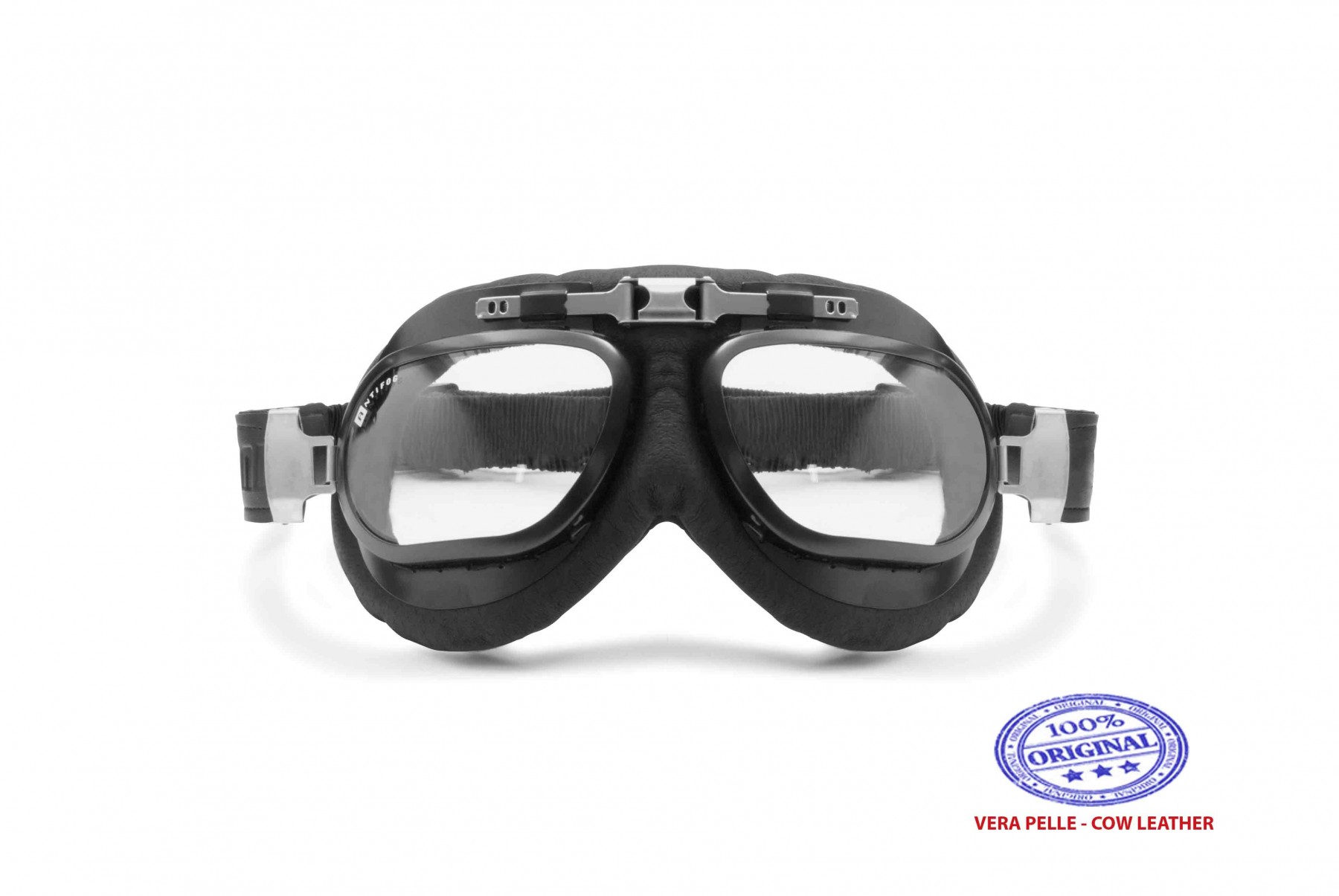 AF191L: Mascara Vintage para moto de los años sesenta con Cuero Genuino Negro Certificado!. La montadura esta echa en acero inoxidable en color negro matte. Las lentes estan echas en policarbonado antichoque con 2,2 mm de espesor y estan tratadas con una resina anticondensacion y anti-vaho. El broche clasico es ajustable y puede ser adaptado a cualquier tipo de casco"jet". La forma es envolvent, protege los ojos del viento, las salpicaduras y la intemperie - Información Adicional
