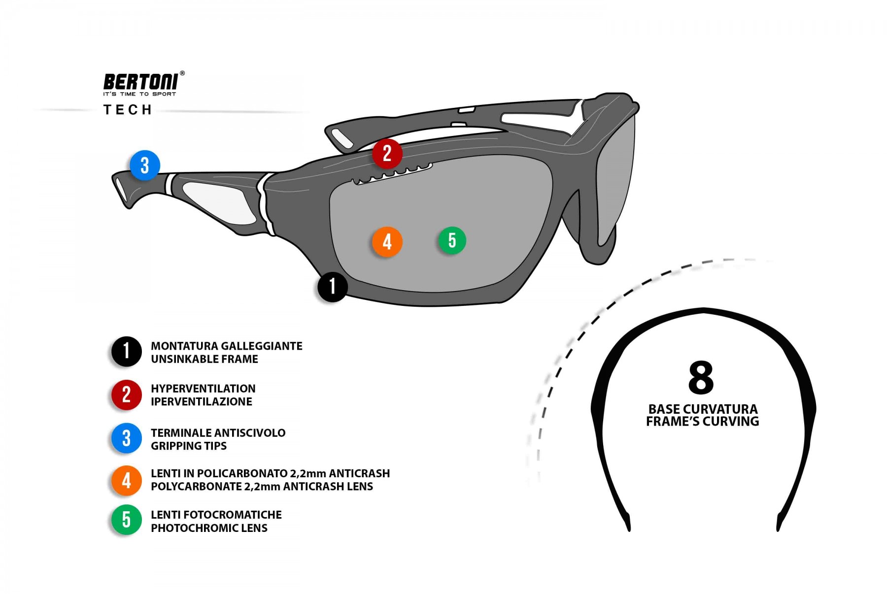 Gafas deportivas en "TPX-lightest polymer" , frame density 0.83g. flexible, resistente a los impactos y flotante. NUEVAS Lentes fotocromaticas 2.2 mm a prueba de choque, 8 seg. de claro cat. 0 a gris cat 3 - se adaptan a los cambios de luminosidad - innovadora Tecnología, las lentes reaccionan constantemente a la luz y a los rayos UV. Al aire libre se oscurecen rápidamente hasta categoría 3, aclarándose hasta una total transparencia en interiores o en condiciones de poco brillo. La protección 100% UV se mantiene siempre. Lentes Anti-Vaho Antigolpe - 100% UV Protection - Forma envolvente: protege los ojos del viento y la intemperie, mejor visión periférica. Las lentes están descentradas para evitar distorsiones ópticas. Incluido una banda elástica ajustable para aumentar la adherencia a la cara para deportes extremos y deportes acuaticos. Agujeros especiales en la lente para mejorar la ventilación y el anti-vaho