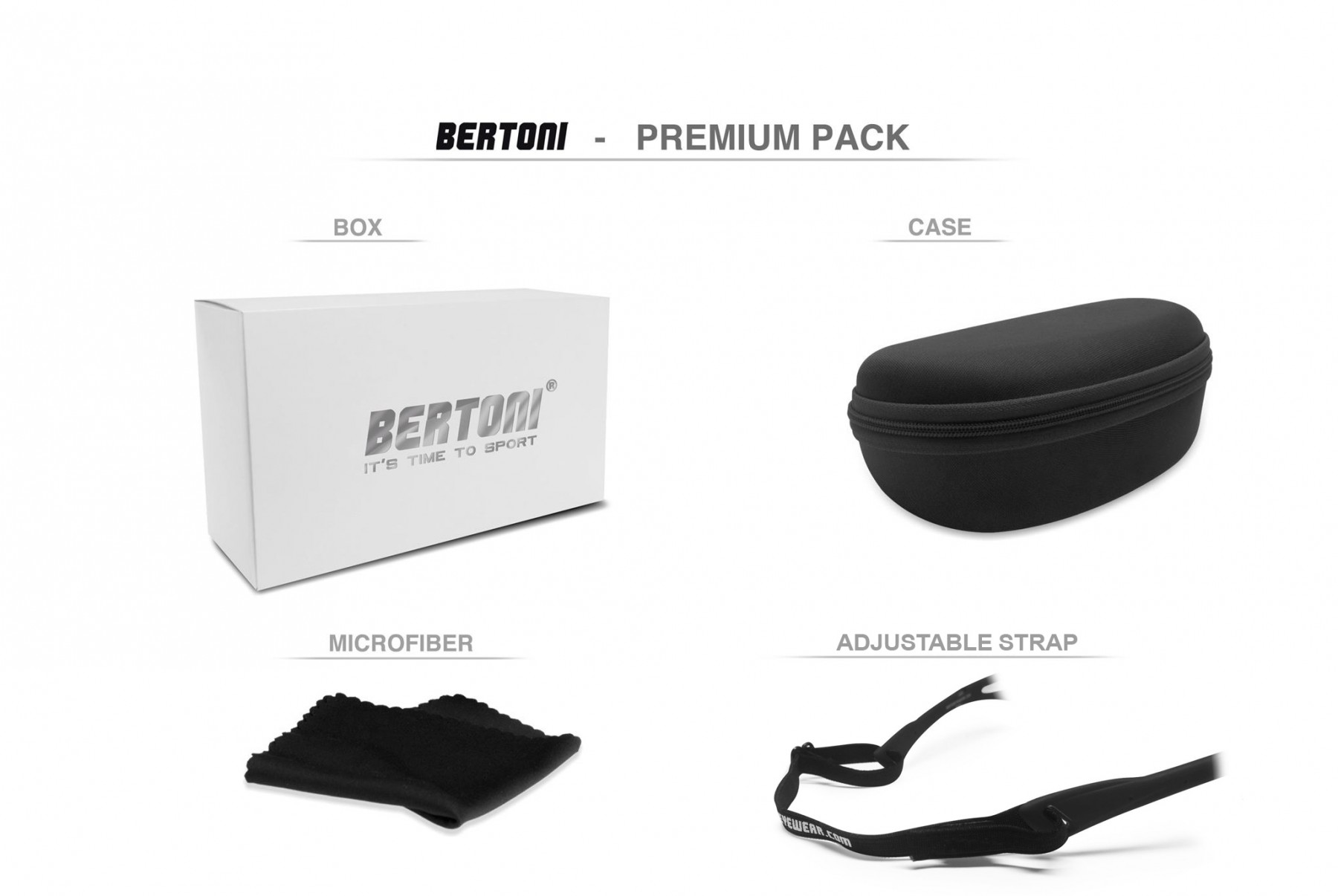 Bertoni Gafas de Sol Deportivas para Moto – mod. F1001: PRODUCTO: F1001 Bertoni Italy - Telar en TPX, polímero más ligero y resistente, densidad 0.83g. - Forma envolvente: protege los ojos del viento y la intemperie, proporciona una visión periférica mejorada. - Tamaño: adecuado para todo tipo de caras (de finas a anchas). LENTE: NUEVAS Lentes fotocromaticas 2.2 mm a prueba de choque, 8 seg. de claro cat. 0 a gris cat 3 - se adaptan a los cambios de luminosidad - innovadora Tecnología, las lentes reaccionan constantemente a la luz y a los rayos UV. Al aire libre se oscurecen rápidamente hasta categoría 3, aclarándose hasta una total transparencia en interiores o en condiciones de poco brillo. La protección 100% UV se mantiene siempre. MÁS CARACTERÍSTICAS: La almohadillas ajustable para la nariz es cómoda y ofrece un ajuste excepcional para cualquier forma de cara. Este sistema también se puede usar para ajustar la altura de las gafas de sol y la distancia con respecto a la cara para evitar que se empañen. Almohadilla para la nariz hecha por TPR60A natural, antialérgica, resistente al agua y condiciones extremas- Extremos de las patillas y del pont nasal antideslizantes - Medio marco: lentes ventiladas, previene y limita la aparición de vaho. ACCESORIOS: Incluido una banda elástica ajustable para aumentar la adherencia a la cara para deportes - Estuche - Paño de limpieza - Caja.