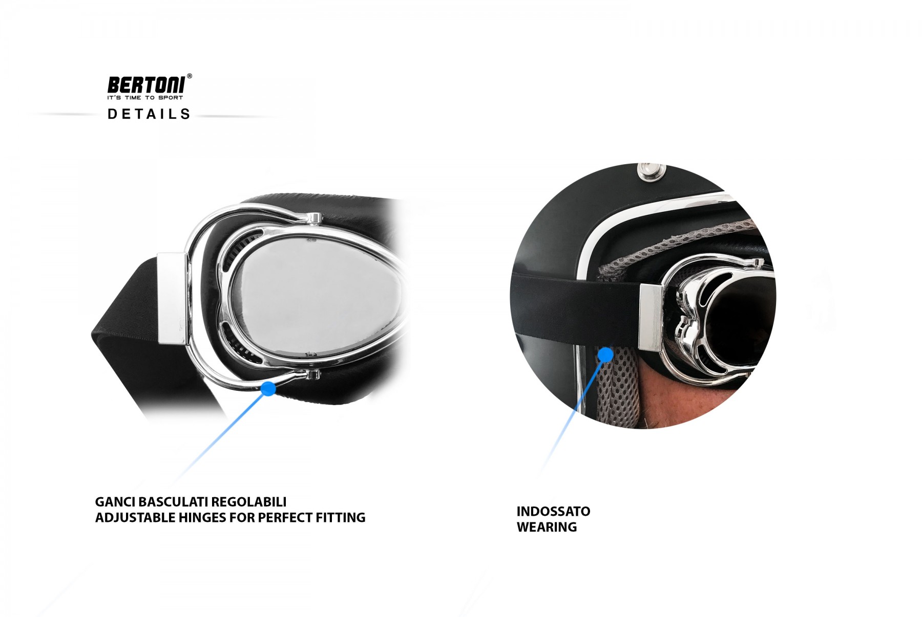 Lunette Moto Vintage Retro Aviateur Compact Design by Bertoni Italy AF77. Compact design et Crochets Réglables pour assurer un ajustement serré parfait, maintien optimal pour tout casque ouvert - Crochets intégrée en mesure d'obtenir une meilleure étanchéité avec le visage. Forme enveloppante : protège les yeux du vent, des projections, des intempéries - confère une meilleure vision périphérique. Verres Anti-Buee Antichoc en polycarbonate 2.2 mm d'épaisseur - 100% UV Protection. Trous d'hyperventilation afin de réduir la formation de buée. Bandeau élastique régable.