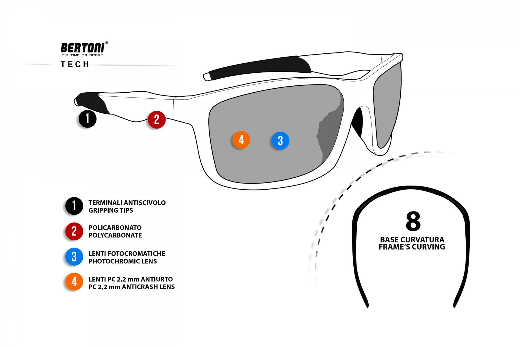 Lunettes de Soleil Sport Verres Photochromatiques de Moto - by Bertoni Italy ALIEN-F: NOUVELLES Verres photochromiques Anti-buée, technologie innovante par transparent Cat. 0 à Gris Cat. 3 - s'adapte aux changements de luminosité, les verres foncent rapidement en extérieur et redeviennent clairs lorsque l'intensité lumineuse diminue. Monture en Nylon Mesh anti-choc - Taillant : convient à tous types de visages (de fins à grands). Forme enveloppante: protège les yeux du vent, des projections, des intempéries. Grip sur l'embout de branche et le nez : empêche les lunettes de glisse. Lunettes de Sport résistant aux chocs mais, grâce à la forme, utilisables de tous les jours utilisables.