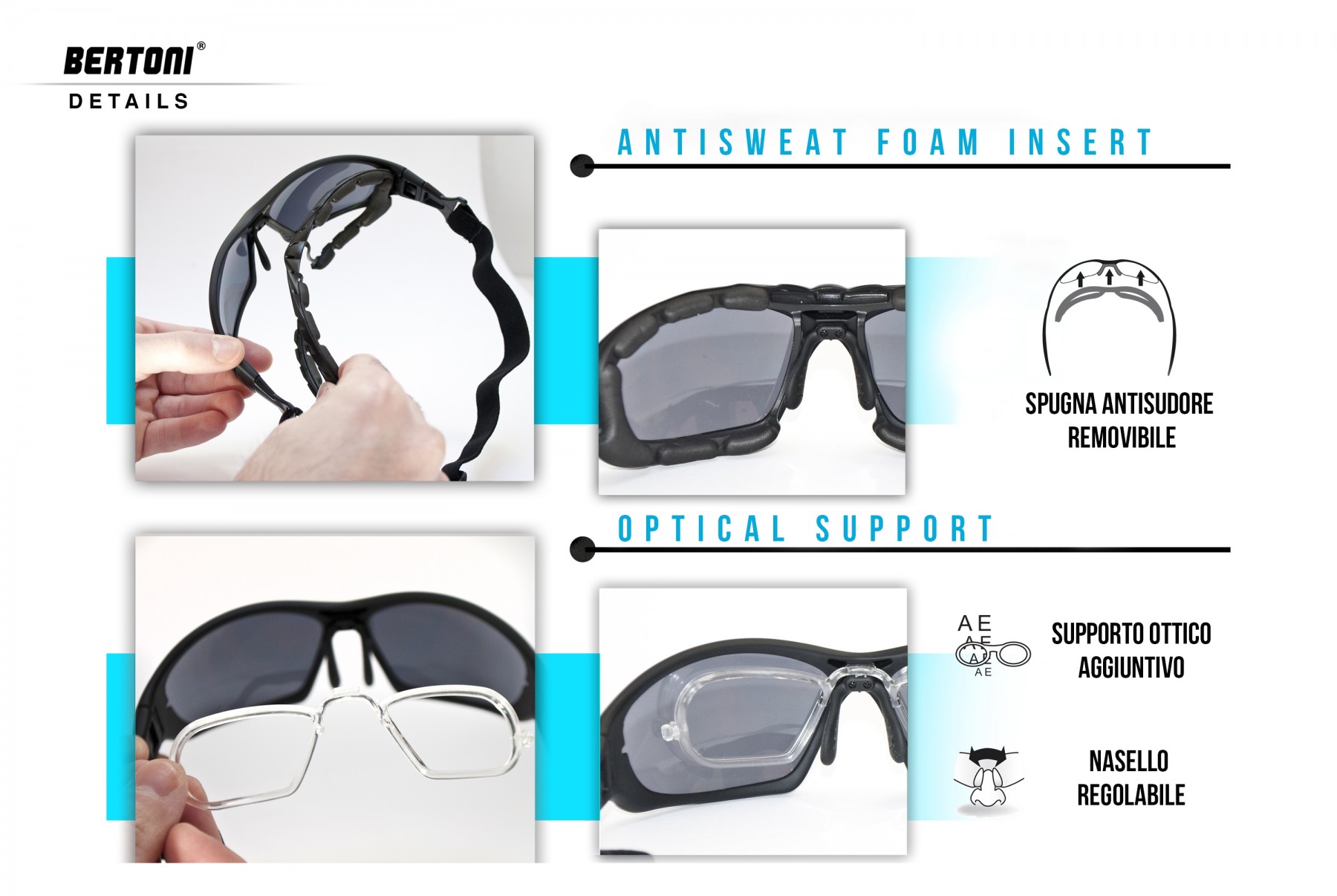 Lunettes photochromiques convertible en goggles by Bertoni Italy. Toutes les athlètes seront pris par les caractéristiques de ces verres photochromiques polarisées. Les verres photochromiques polarisés combinent la polyvalence des verres photochromiques traditionnels, qui s'adaptent aux changements de lumière, avec la caractéristique anti-éblouissante des verres polarisés. La polarisation bloque l'effet éblouissant de la lumière, des premières heures sombres du matin sous le soleil aveuglant de midi aux longues ombres de la fin de l'après-midi. Le verre polarisé jaune est celui défini comme le «verre haute définition» par excellence, idéal pour la conduite et les activités sportives qui nécessitent une augmentation du contraste dans des conditions de faible luminosité, pluie, brouillard, etc. Verres photochromiques cat. 1-3 réagissent aux rayons UV et ne s'assombrissent pas lorsqu'ils sont portés derrière une visière de casque ou un pare-brise qui bloque la lumière UV. Ils doivent être exposés à la lumière directe du soleil pour être activés. Ces lunettes sont convertible en goggles, parfait pour toutes les sports, les branches peuvent être changées rapidement avec un adjustable cord. Insert optique pour verres correcteurs détachable. Votre opticien pourra facilement et rapidement assembler les verres de prescription