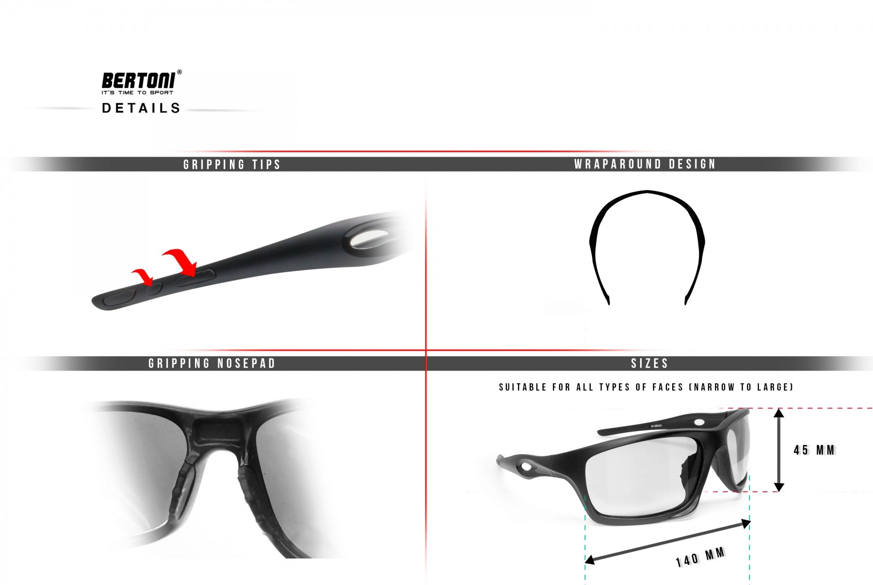 Lunettes de Moto Photochromiques Enveloppantes Coupe-vent – mod. Omega AF by Bertoni Italy: - Verres anti buee photochromiques seulement 8 secondes pour passer du clair au foncé - S'éclaircit et s'assombrit automatiquement suivant l'environnement lumineux - Verres Coupe-Vent en polycarbonate antchoc - 100% UV protetion. - Monture en Nylon Mesh anti-choc - Taillant : convient à tous types de visages (de fins à grands). - Forme enveloppante : protège les yeux du vent, des projections, des intempéries. -Grip sur l'embout de branche et le nez : empêche les lunettes de glisse. - À l'occasion du trentième anniversaire de Bertoni dans le monde des lunettes de sport, Omega, la nouvelle née de la maison, a été marquée au laser sur la branche avec le “ B “ logo original des années 90 - Lunette de Sport résistant aux chocs mais, grâce à la forme, utilisables de tous les jours.