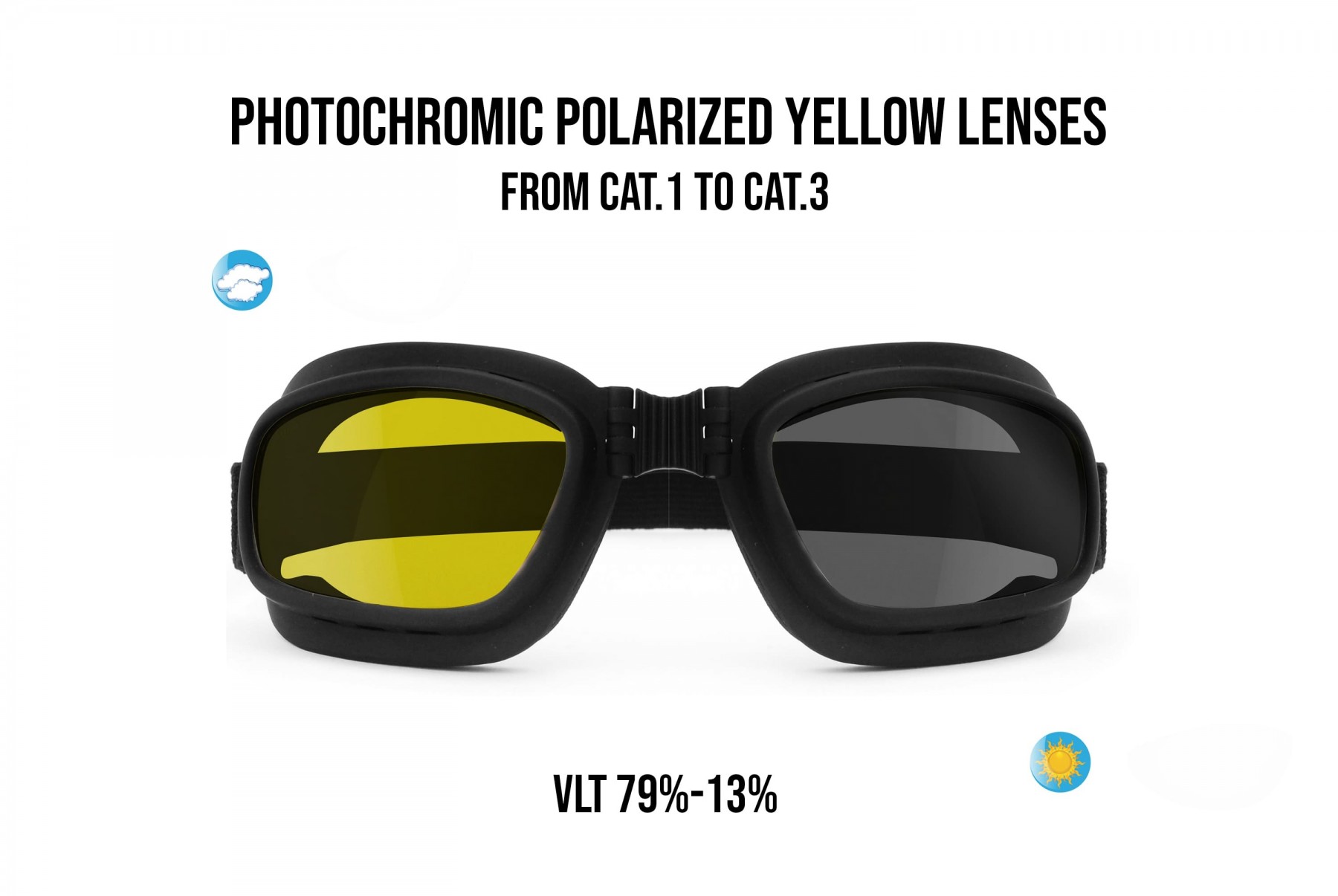Lunettes masque moto avec verres photochromiques polarisés mod. P112FTA de Bertoni. L'intérieur du devant est recouvert de néoprène souple et le pont est flexible afin que le masque puisse être plié sur lui-même, réduisant ainsi de moitié sa taille lorsqu'il n'est pas utilisé. L'élastique rigoureusement noir est réglable. Le verre photochromique polarisé jaune est recommandé dans toutes les conditions d'éclairage. Bertoni garantit un service après-vente à vie pour toutes ses lunettes et masques.
