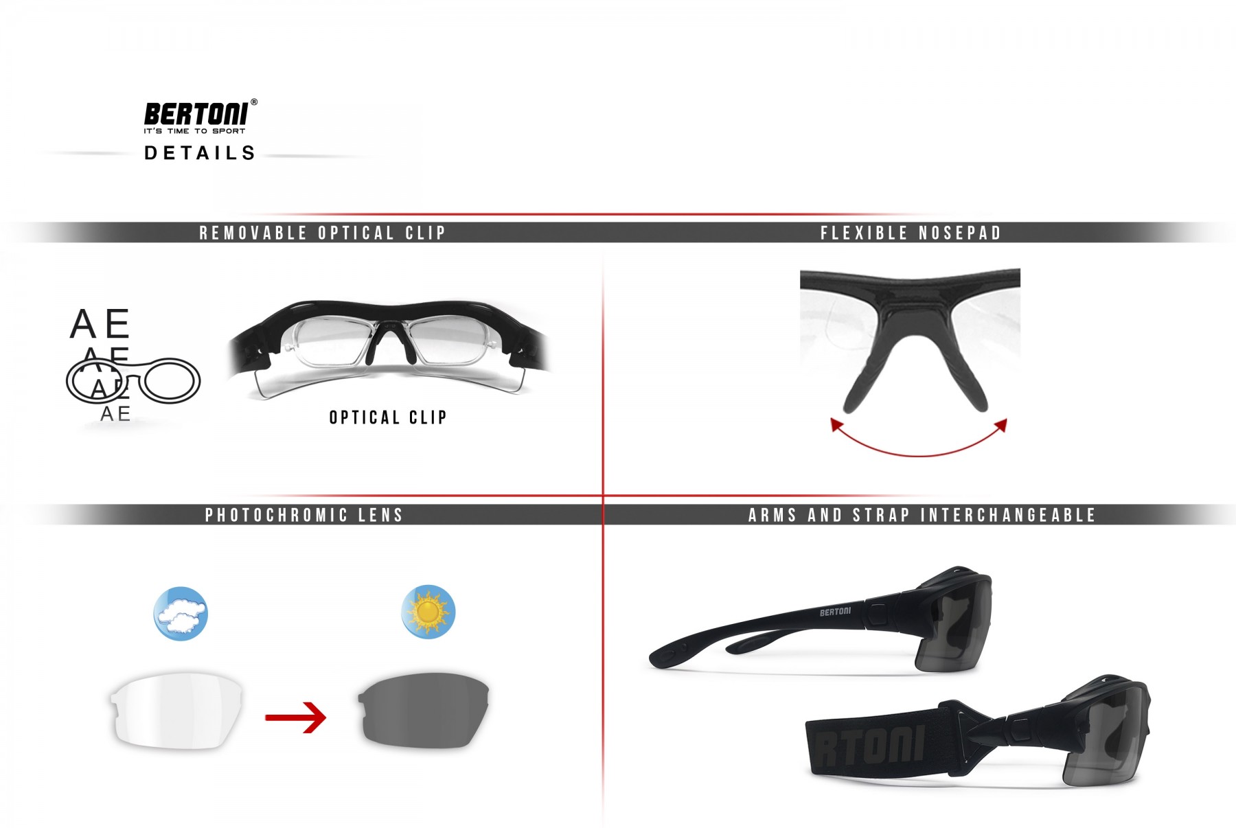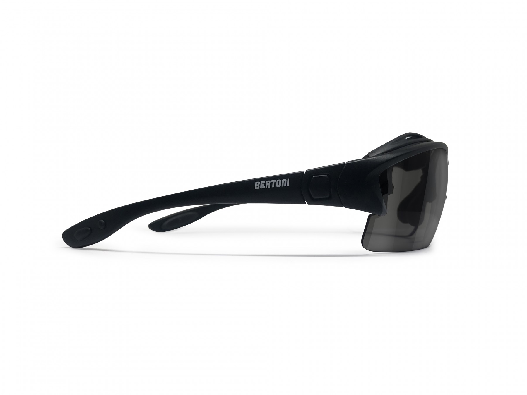 Occhiali Moto da Vista Graduabili Antivento Avvolgenti - Aste ed Elastico intercambiabili - Lenti Fotocromatiche Antiappannanti– F399 by Bertoni Italy: Montatura: policarbonato antiurto - colore: nero opaco - Forma avvolgente che migliora la visione periferica: protegge gli occhi dal vento e dalle intemperie - Calzata adatta a tutti i tipi di viso (da sottili a grandi). NUOVA rivoluzionaria lente fotocromatica fotosensibile antiappannante da trasparente Cat. 0 a grigio Cat. 3, fabbricata in PC 2.2mm antiurto - si adattano automaticamente ai cambiamenti di luminosità e si scuriscono velocemente fino a una lente da sole di categoria 3 in esterni, in condizioni di luminosità elevata, ritornando trasparenti in condizioni di luminosità bassa o interni. La protezione UV 100% è sempre attiva. Le lenti sono decentrate per evitare ogni possible distorsione ottica. L'interno del frontale è rivestito con un morbido inserto removibile antivento/antisudore - Naselli regolabili per assicurare una calzata aderente e confortevole. Le astine possono essere facilmente sostituite dall'elastico ottenendo una calzata più aderente per tennis, calcio, basket, moto, sport estremi, etc. - Logo stampato a caldo nero su nero. Inclusa una clip ottica sulla quale montare lenti da vista se necessarie, ottimizzato per ogni potere diottrico. Il tuo ottico di fiducia potrà facilmente montare le tue lenti da vista sulla clip permettendoti di indossare occhiali sportivi antivento da vista senza nessun limite di gradazione.