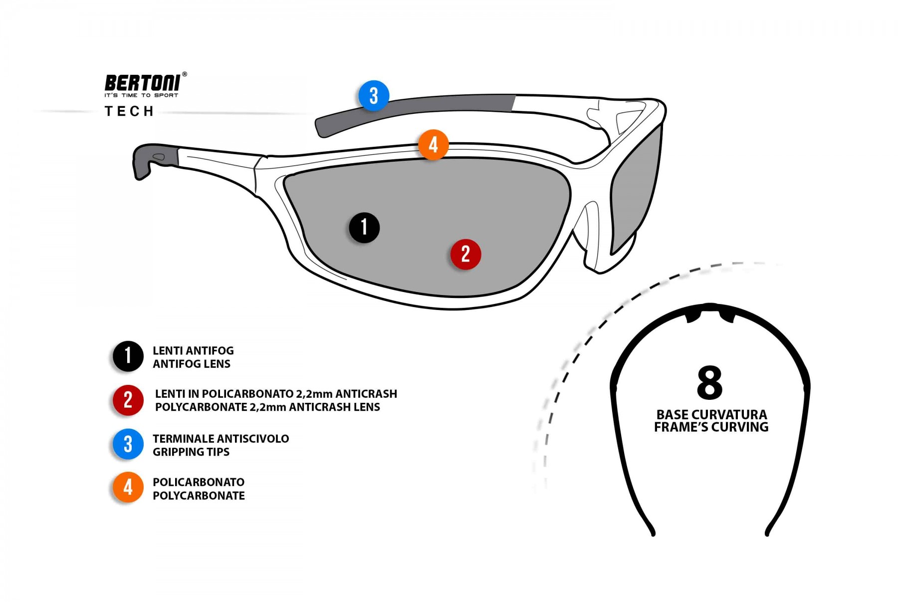 Montatura nero gomma effetto "soft touch" in policarbonato antiurto - Forma avvolgente che migliora la visione periferica: protegge gli occhi dal vento e dalle intemperie. Clip per lenti da vista in policarbonato - incluso e facilmente removibile per le operazioni di pulizia, il tuo ottico di fiducia potrà facilmente montare le lenti da vista sulla clip. Calzata adatta a tutti i tipi di viso (da sottili a grandi) - Le placchette nasali ed i terminali sono rivestite in Megol antiscivolo per accentuare l'aderenza ed ottimizzare la stabilità degli occhiali. Lente antiappannante antiurto 2,2 mm. di spessore in policarbonato - 100% UV protection - Lenti con trattamento antifog che impedisce all'umidità di appannare le superfici della lente disperdendola grazie ad uno speciale strato di materiale tensioattivo.