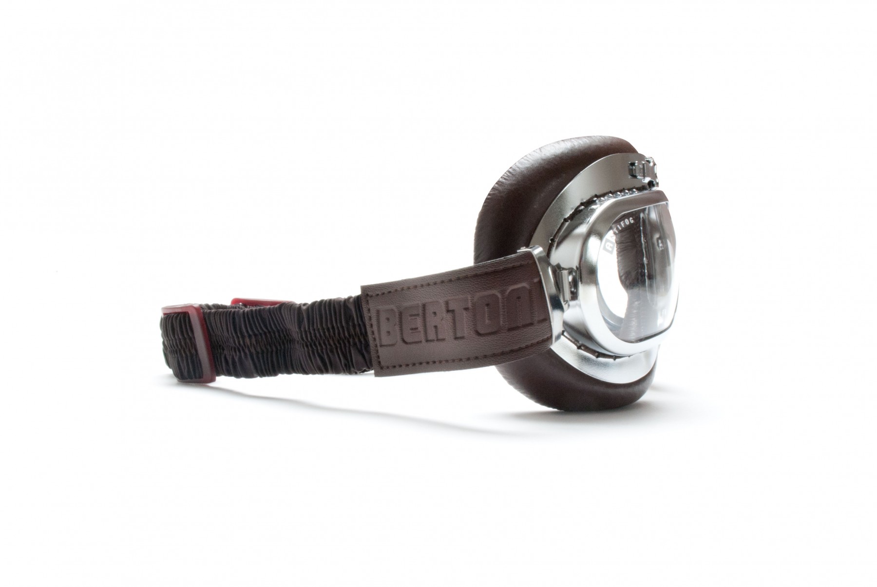 Classica maschera in pelle Dei epoca motociclisti anni '60. La montaura è in Acciaio inossidabile cromato e rivestita di pelle marone. Le lenti Sono in policarbonato antiurto 2,2 mm. di spessore e trattate con Una resina anticondensa Che ne impedisce l'appannamento. Il classico elastico e regolabile e si Adatta a tutti i Tipi di caschi "jet". - Ulteriori informazioni