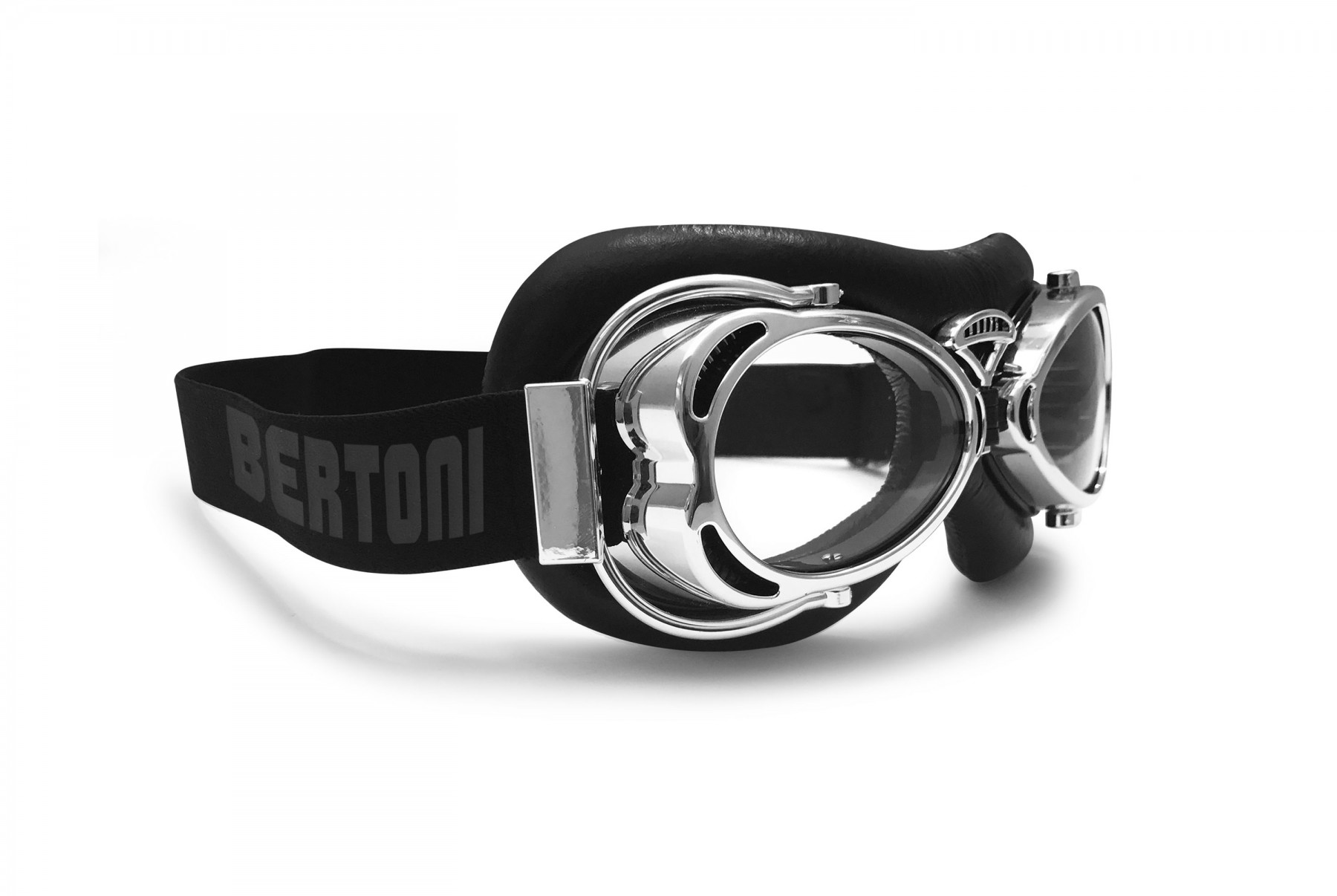 Bertoni Occhiali Moto Vintage Retro Neri Dimensioni Compatte by Italy AF77B Occhiali da Aviatore Cromati per Caschi. Design compatto per essere ospitati in qualsiasi casco e aderenti a qualsiasi taglia di viso anche femminile. Ganci Basculanti "outriggers" che si adattano alle curve del casco per una calzata ottimale. Lenti con Trattamento Antiappannante Antiurto 2.2mm - UV400 - 100% UV Protection. Fori di iperventilazione per ridurre la possibilità di appannamento. Elastico regolabile in lunghezza - Forma avvolgente che migliora visione periferica: protegge gli occhi dal vento e dalle intemperie.