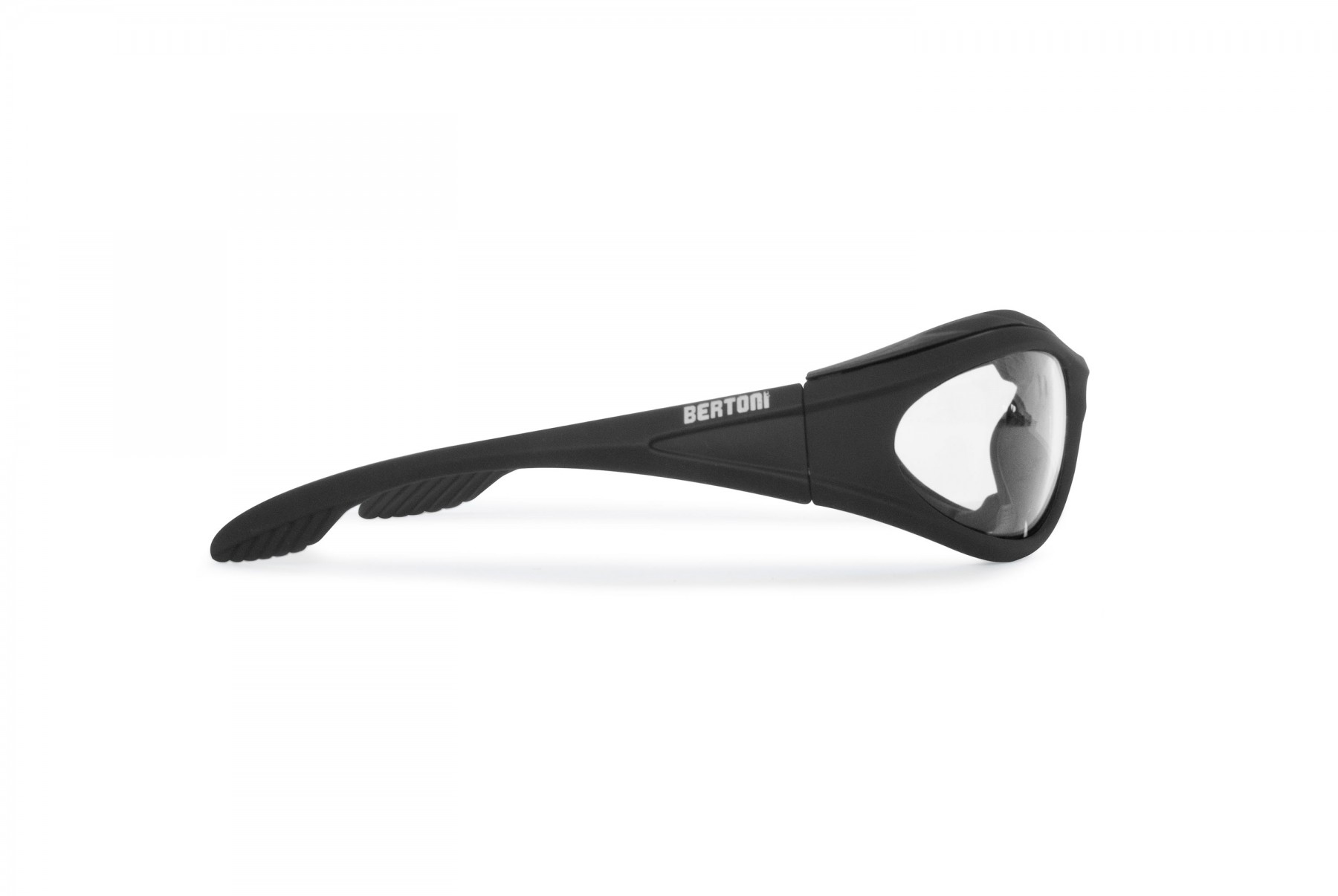 F125A by Bertoni Italy: occhiali da moto e protezione antivento ed antiurto con lente fotocromatica 2,2 mm. di spessore in policarbonato. La lente fotocromatica è consigliata in tutte le condizioni di luminosità. Le lenti fotocromatiche in policarbonato antiurto proteggono gli occhi ogni giorno, in presenza di sole, di cielo coperto o in condizioni atmosferiche intermedie. Inoltre, sono trattate con una speciale resina in grado di disperdere la condensa che si forma sulle superfici delle lenti nel passaggio dal caldo al freddo. I tempi di reazione delle lenti fotocromatiche sono molto rapidi: solo 8 secondi per passare dal chiaro allo scuro, e 35 secondi dallo scuro al chiaro. L'interno del frontale è rivestito con un morbido Inserto removibile antivento, polvere e sudore La colorazione nero opaca rende l'occhiale molto aggressivo e particolarmente indicato per moto. Bertoni garantisce un servizio di assistenza post vendita a vita per tutti i propri occhiali e maschere.