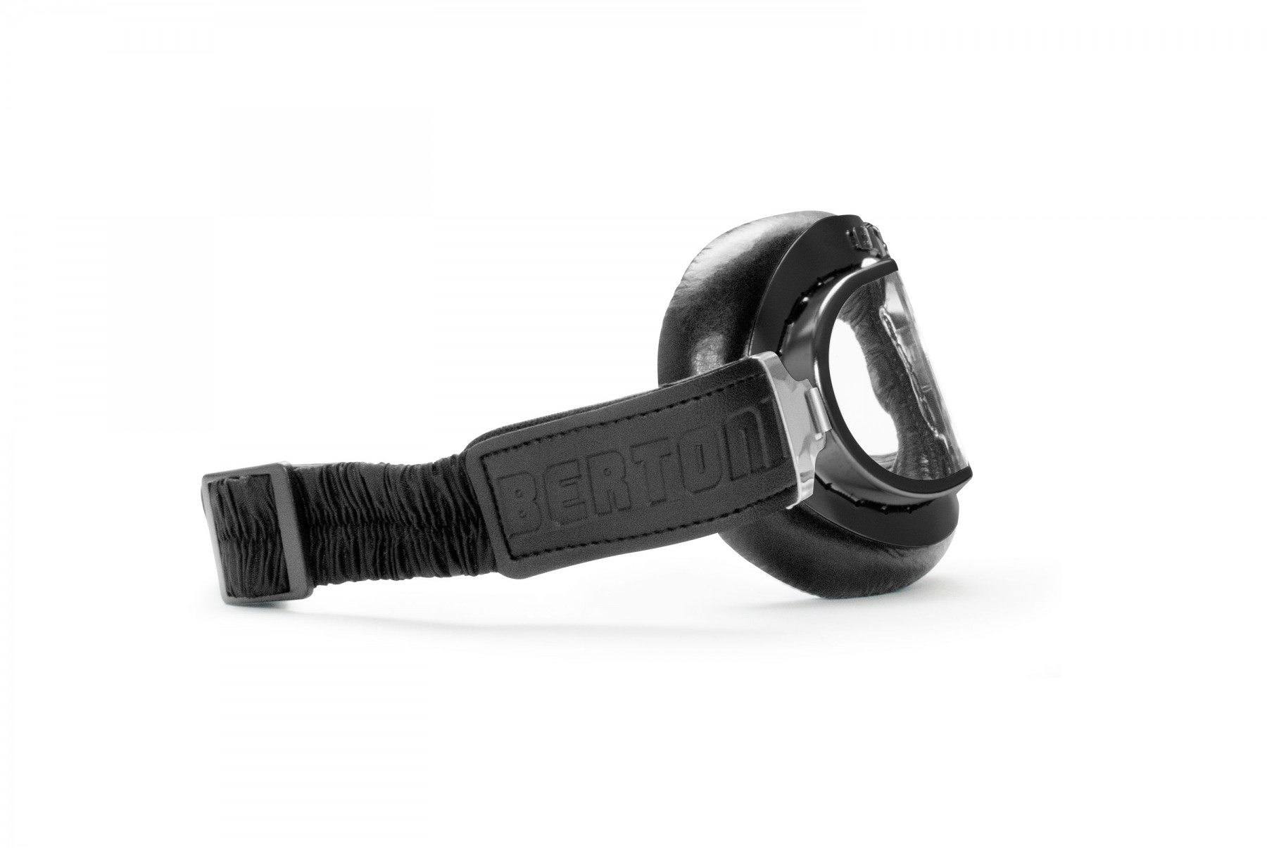 Classica maschera in pelle vintage dei bikers anni '60 con lenti squadrate. La montaura in acciaio inossidabile è rivestita di pelle nera. Le lenti sono in policarbonato antiurto 2,2 mm. di spessore e trattate con una resina anticondensa che ne impedisce l'appannamento. Il classico elastico è regolabile e si adatta a tutti i tipi di caschi " jet ". - Ulteriori informazioni
